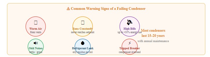 Neispravan ili prljav kondenzator izravno pogoršava performanse i učinkovitost vašeg klimatizacijskog sustava. Pazite na ove znakove upozorenja: